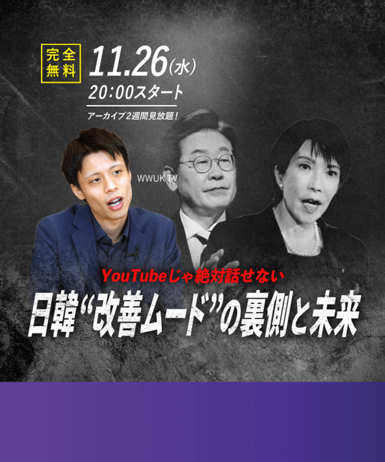 韓国出身で日本に帰化。チャンネル「WWUK TV」は登録者数40万人を超え、日韓関係や国際情勢の“リアル”を独自の視点で発信。